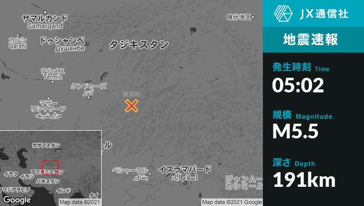 1月17日 05:02頃、アフガニスタンのJurmから南南西38kmの地点でM5.5の地震がありました。
