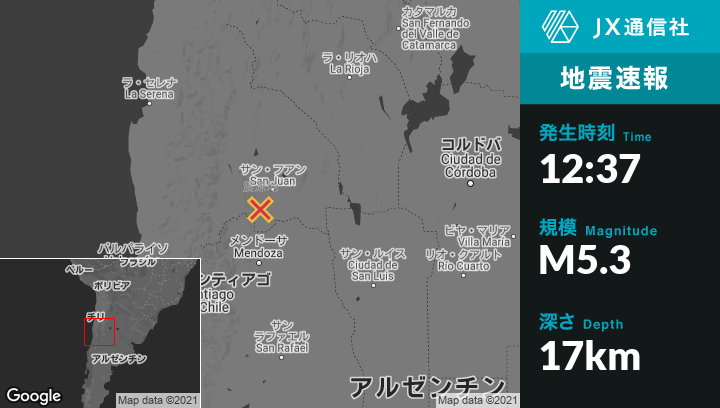 1月19日 12:37頃、アルゼンチンのPocitoから西南西24kmの地点でM5.3の地震がありました。
