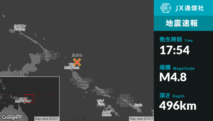 1月20日 17:54頃、パプアのArawaから北北西175kmの地点でM4.8の地震がありました。