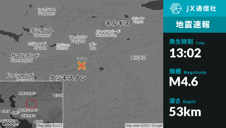 1月22日 13:02頃、キルギスタンのDaroot-Korgonから南南西32kmの地点でM4.6の地震がありました。
