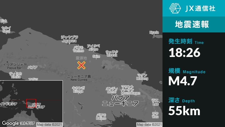 1月22日 18:26頃、パプアのAitapeから南西133kmの地点でM4.7の地震がありました。