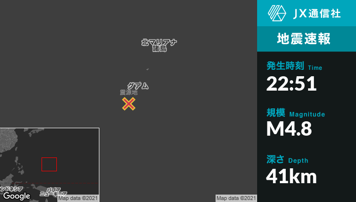 1月22日 22:51頃、グアムのMerizo Villageから南南西61kmの地点でM4.8の地震がありました。