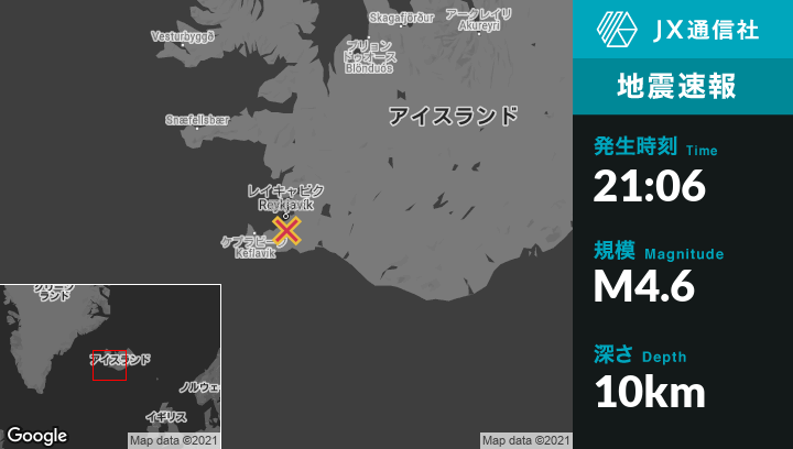 | 震源地 | アイスランドのHafnarfjörðurから北北東0kmの地点 |