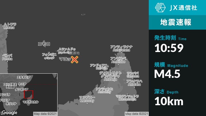 | 震源地 | マヨットのPamandziから東北東44kmの地点 |