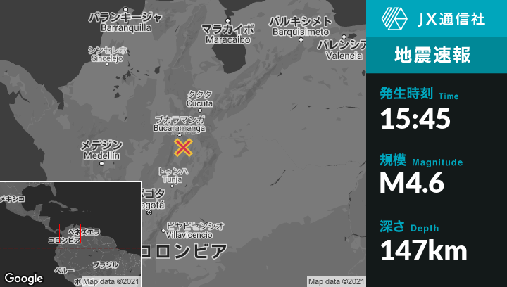 | 震源地 | コロンビアのCepitáから北北西12kmの地点 |