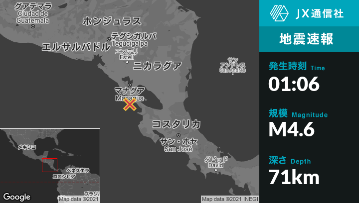 3月05日 01:06頃、ニカラグアのTolaから西33kmの地点でM4.6の地震がありました。