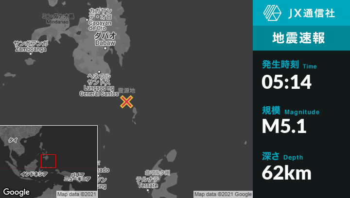 | 震源地 | フィリピンのSaranganiから東南東117kmの地点 |