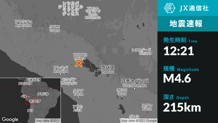 3月14日 12:21頃、ペルーのJuliacaから西南西9kmの地点でM4.6の地震がありました。