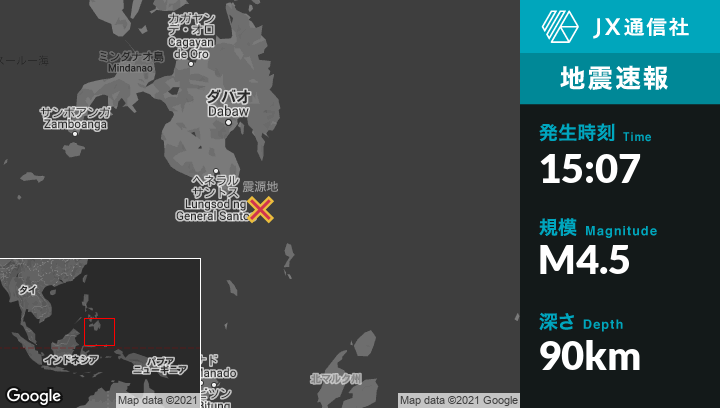 | 震源地 | フィリピンのSaranganiから東76kmの地点 |