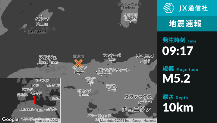 3月18日 09:17頃、アルジェリアのBejaïaから北東29kmの地点でM5.2の地震がありました。