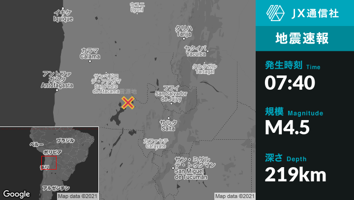 3月19日 07:40頃、アルゼンチンのSan Antonio de los Cobresから西北西95kmの地点でM4.5の地震がありました。