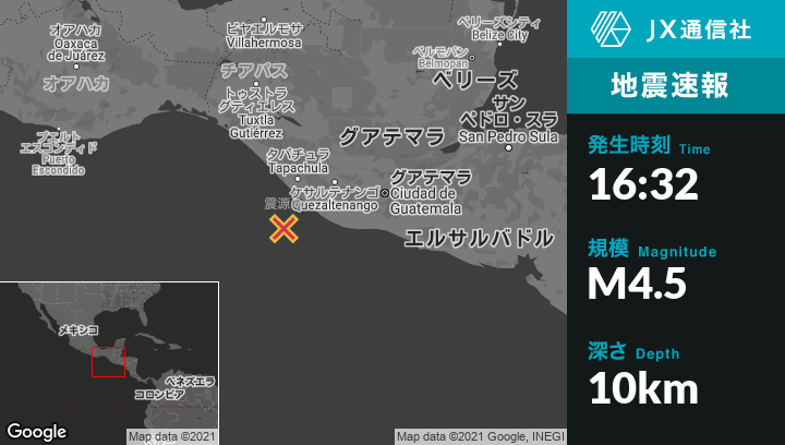 3月19日 16:32頃、グアテマラのOcósから南西64kmの地点でM4.5の地震がありました。