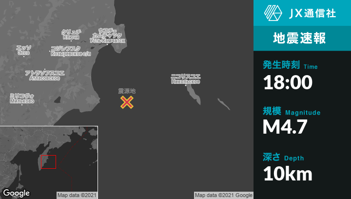 3月19日 18:00頃、ロシアのUst’-Kamchatsk Staryyから南南東165kmの地点でM4.7の地震がありました。
