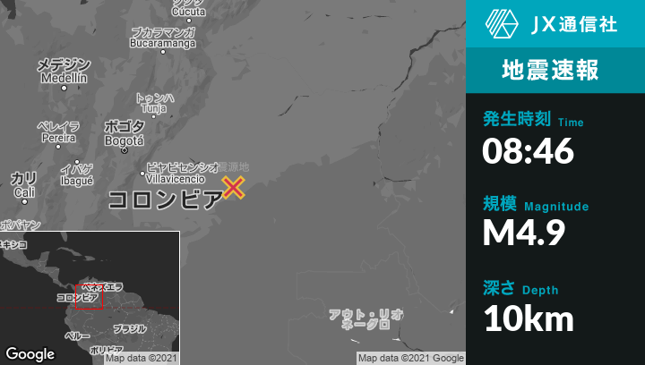 3月21日 08:46頃、コロンビアのPuerto Gaitánから東南東84kmの地点でM4.9の地震がありました。