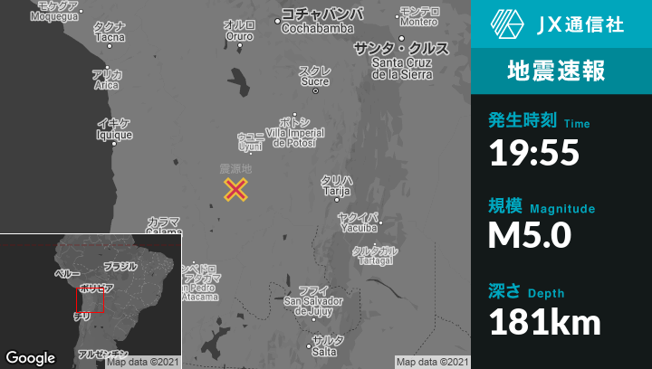 3月21日 19:55頃、ボリビアのUyuniから南南西87kmの地点でM5.0の地震がありました。