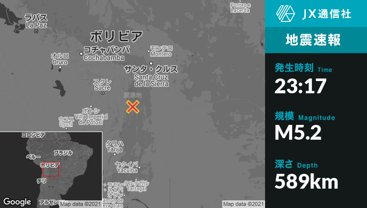 3月21日 23:17頃、ボリビアのMonteagudoから北34kmの地点でM5.2の地震がありました。