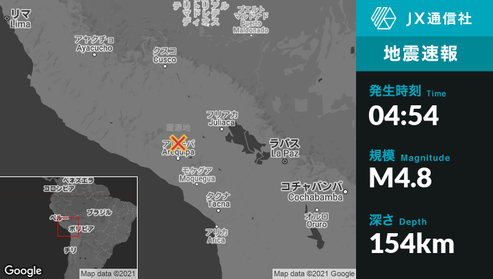 4月27日 04:54頃、ペルーのHuarancanteから南西10kmの地点でM4.8の地震がありました。