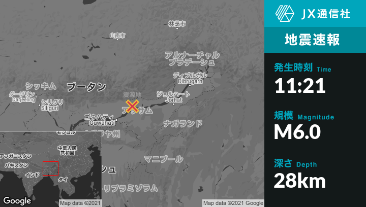 | 震源地 | インドのDhekiajuliから北北西10kmの地点 |