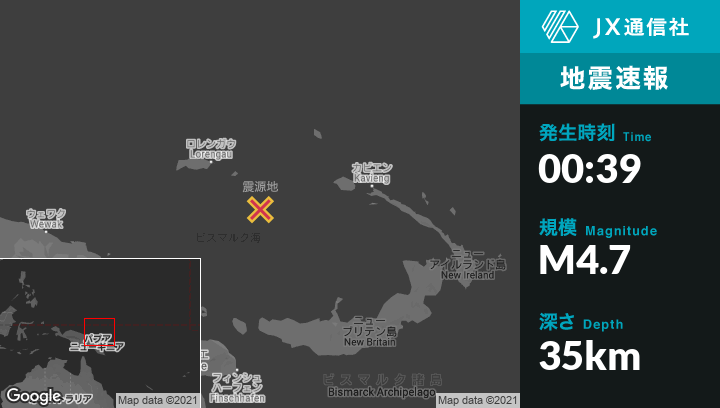 | 震源地 | パプアニューギニアのLorengauから南東159kmの地点 |