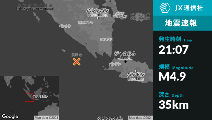 | 震源地 | インドネシアのPagar Alamから南229kmの地点 |
