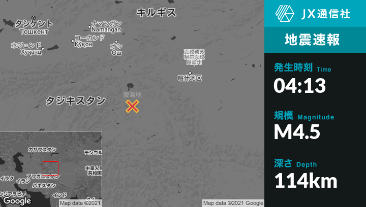 5月04日 04:13頃、タジキスタンのMurghobから北西51kmの地点でM4.5の地震がありました。