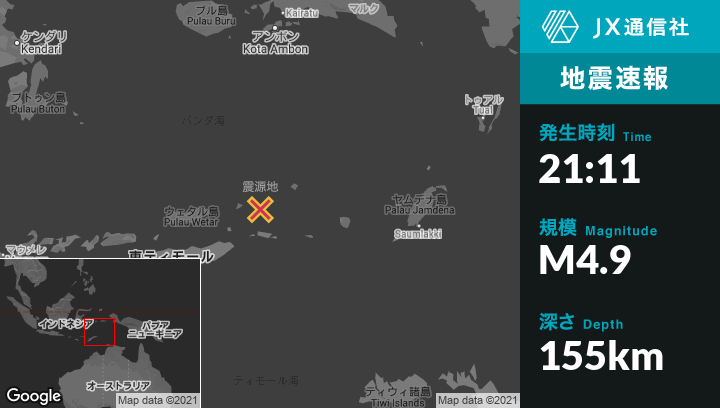 5月06日 21:11頃、東ティモールのLospalosから北東145kmの地点でM4.9の地震がありました。