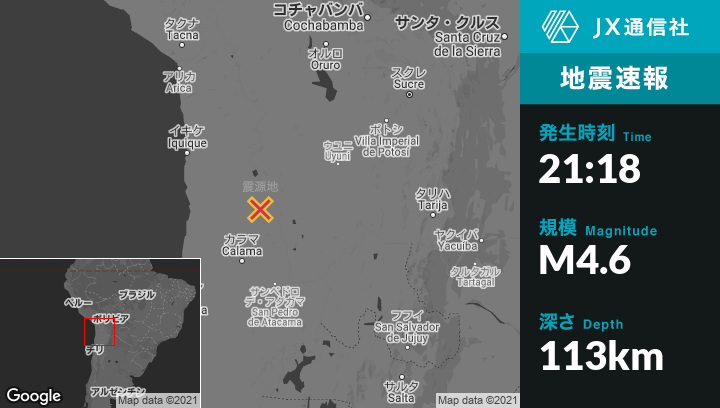 5月06日 21:18頃、チリのCalamaから北北東135kmの地点でM4.6の地震がありました。