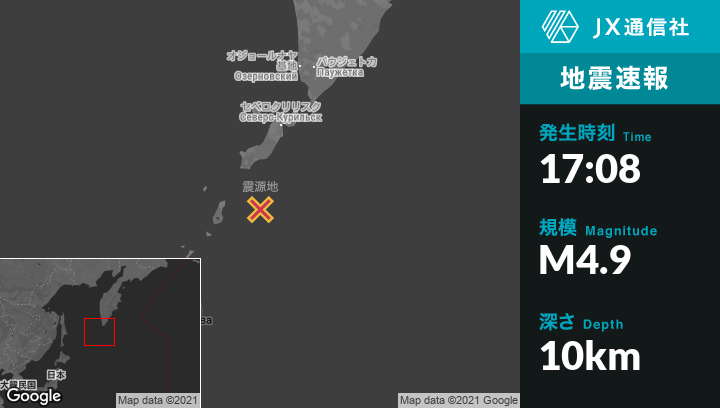 5月07日 17:08頃、ロシアのSevero-Kuril’skから南南西130kmの地点でM4.9の地震がありました。