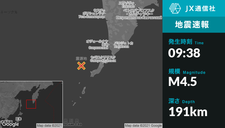 5月08日 09:38頃、ロシアのSevero-Kuril’skから西109kmの地点でM4.5の地震がありました。