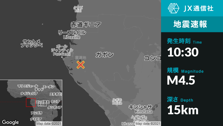| 震源地 | ガボンのLambarénéから南南西54kmの地点 |