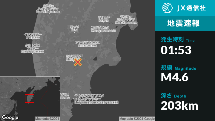 5月11日 01:53頃、ロシアのMil’kovoから東北東19kmの地点でM4.6の地震がありました。