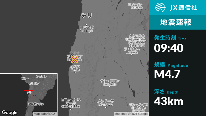 5月14日 09:40頃、チリのLa Serenaから北30kmの地点でM4.7の地震がありました。