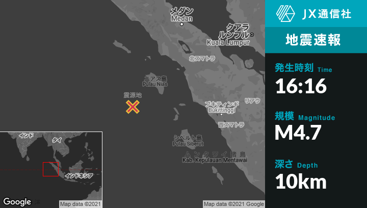 | 震源地 | インドネシアのSinabangから南257kmの地点 |