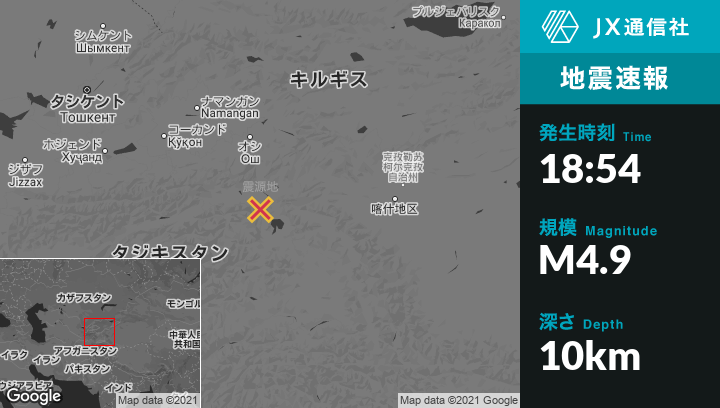 | 震源地 | キルギスタンのKyzyl-Eshmeから東南東68kmの地点 |