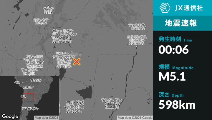 | 震源地 | アルゼンチンのColonia Doraから北西43kmの地点 |