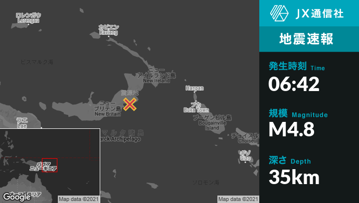 5月21日 06:42頃、パプアニューギニアのKokopoから南南西135kmの地点でM4.8の地震がありました。