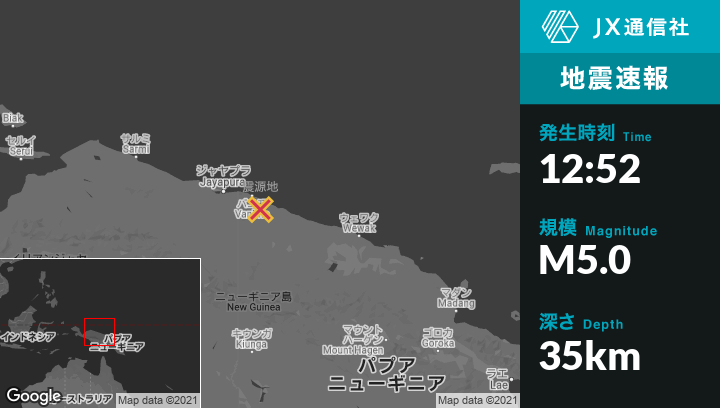 5月21日 12:52頃、パプアニューギニアのVanimoから南東28kmの地点でM5.0の地震がありました。