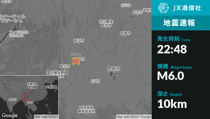 5月21日 22:48頃、中国のDaliから北西29kmの地点でM6.0の地震がありました。
