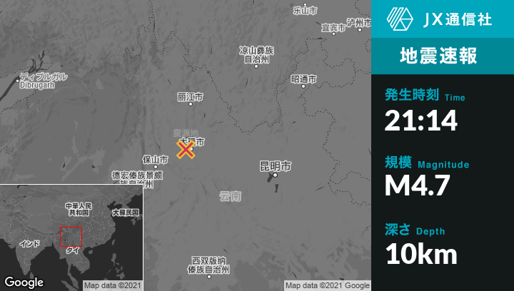 5月22日 21:14頃、中国のDaliから北西18kmの地点でM4.7の地震がありました。