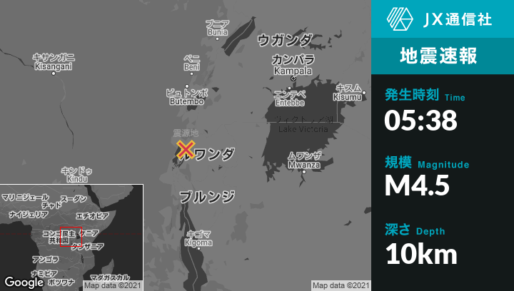 5月24日 05:38頃、ルワンダのGisenyiから東南東0kmの地点でM4.5の地震がありました。
