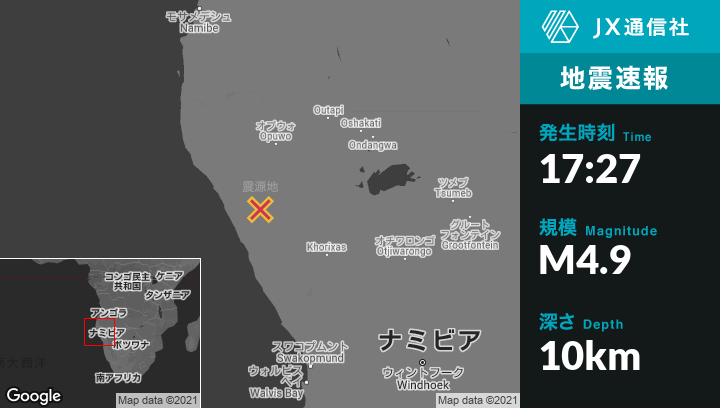 | 震源地 | ナミビアのOpuwoから南南西144kmの地点 |
