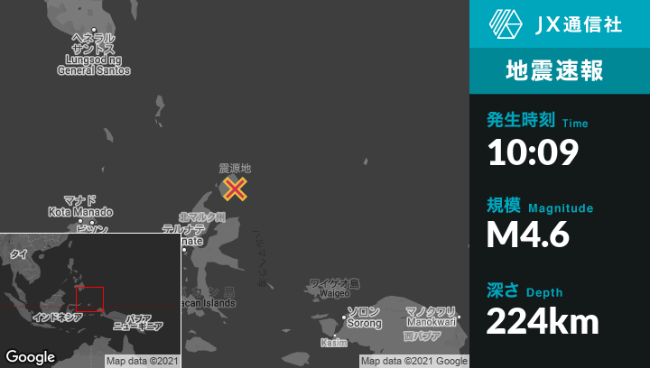 | 震源地 | インドネシアのTobeloから北東96kmの地点 |