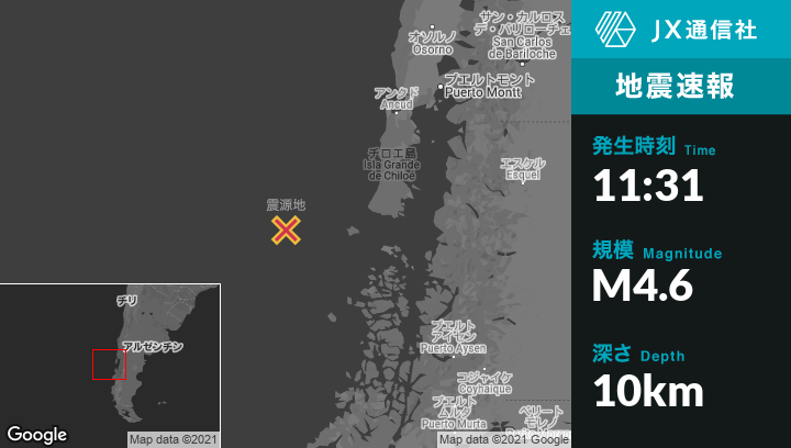 5月25日 11:31頃、チリのQuellónから西201kmの地点でM4.6の地震がありました。