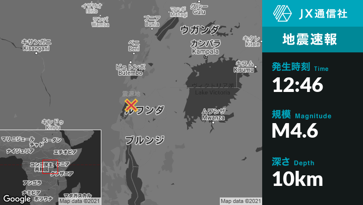 5月26日 12:46頃、ルワンダのGisenyiから東北東9kmの地点でM4.6の地震がありました。