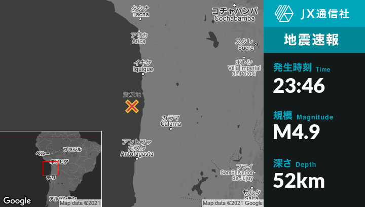 6月04日 23:46頃、チリのTocopillaから北北西85kmの地点でM4.9の地震がありました。