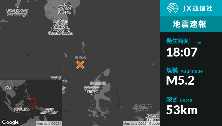 6月06日 18:07頃、インドネシアのTobeloから北西214kmの地点でM5.2の地震がありました。