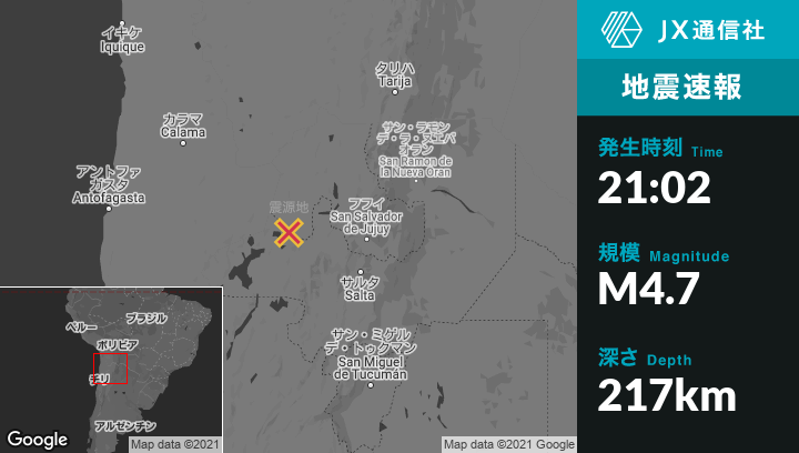 | 震源地 | アルゼンチンのSan Antonio de los Cobresから西北西60kmの地点 |