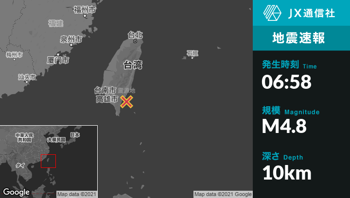 | 震源地 | 台湾のDonggangから東北東77kmの地点 |