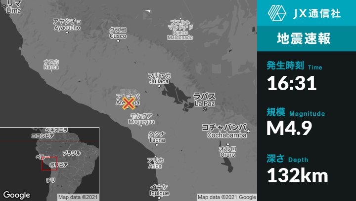 6月13日 16:31頃、ペルーのPucaraから南南西14kmの地点でM4.9の地震がありました。