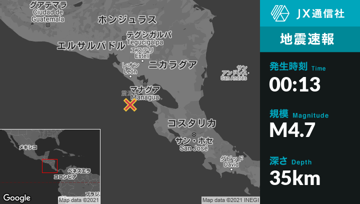 6月14日 00:13頃、ニカラグアのMasachapaから南西66kmの地点でM4.7の地震がありました。